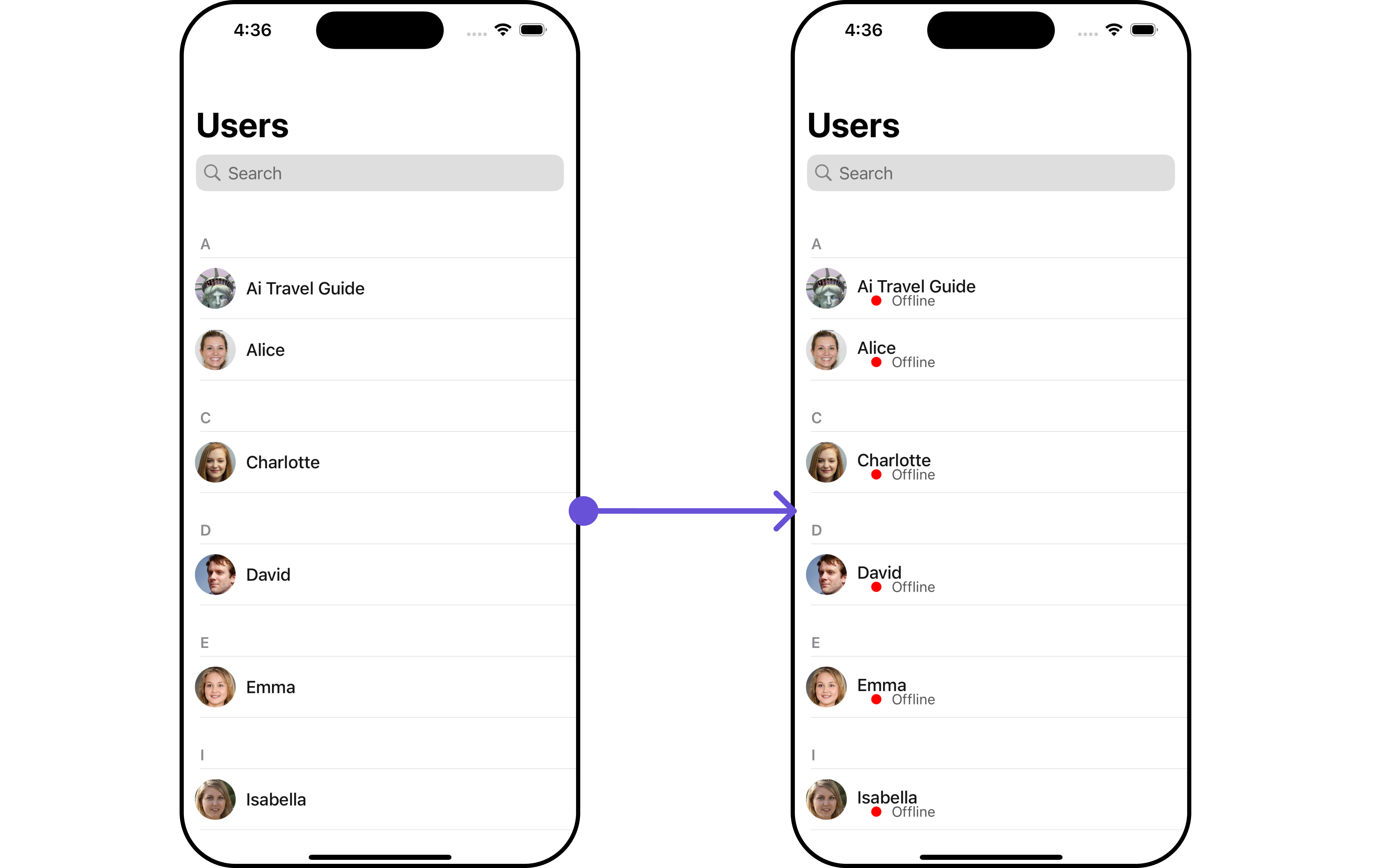 The SearchRequestBuilder uses UserRequestBuilder enables you to filter and customize the search list based on available parameters in UserRequestBuilder. This feature allows you to keep uniformity between the displayed UserList and searched UserList. Example In the example below, we are applying a filter to the UserList based on Search.- Swift