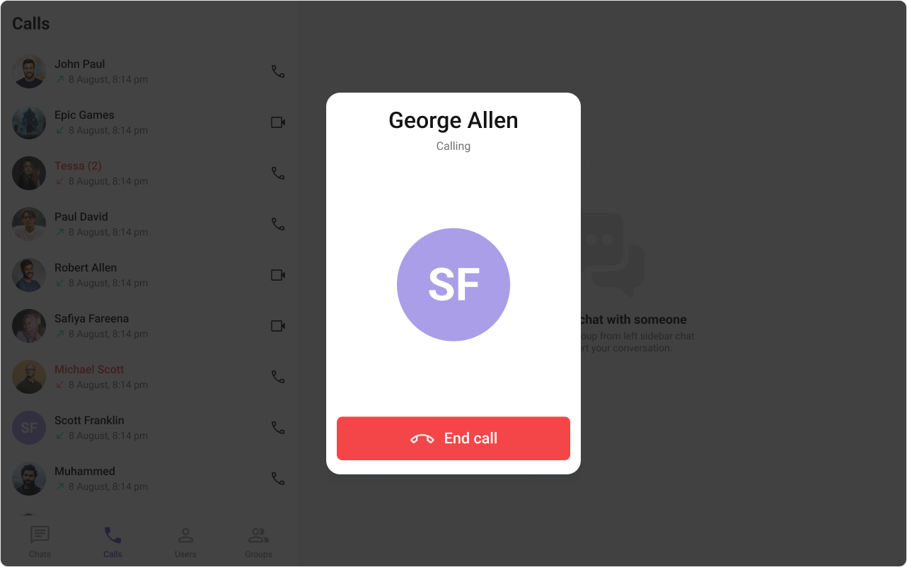 This prop renders the custom cancel-call button view for the outgoing call. Use this to override the existing cancel call button view from the outgoing call. The customized chat interface is displayed below.
